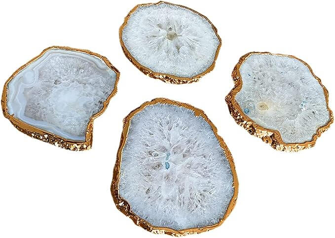 White agate coasters for drinks. Set of 4 with plated edge, surface protectors and no added dyes.