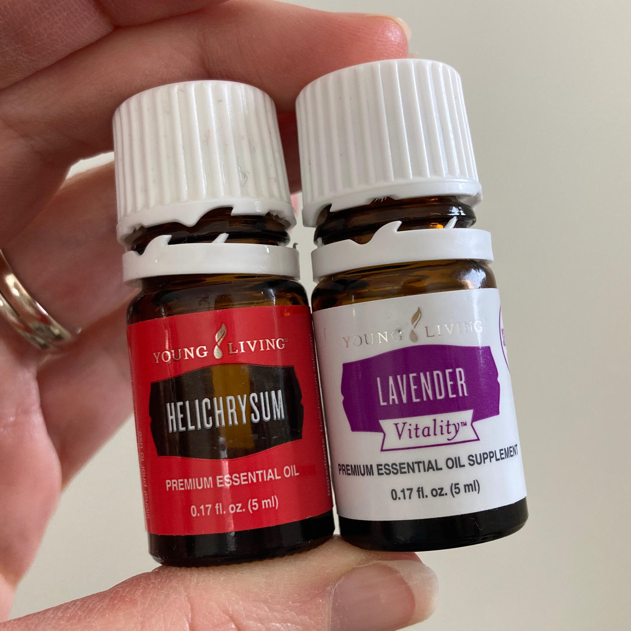 I put 5 drops of Lavender and Helichrysum essential oils on, layered on top of each other undiluted. They’re super helpful for skin, and the first things I reach for whenever a kitchen mishap may occur. I trust Young Living as my essential oil brand and won’t use any other brand of essential oils.